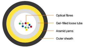 The fibres are positioned in a loose tube made of PBT. The tube is filled with a water-resistant filling compound