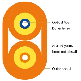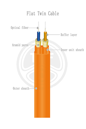 The flat twin cable uses Φ600μm or Φ900μm tight buffered fibre as optical communication medium, the tight buffered fibre wrapped with a layer of aramid yarn as strength member, such unit is extrude with a layer as inner sheath. The cable is completed with an outer sheath.